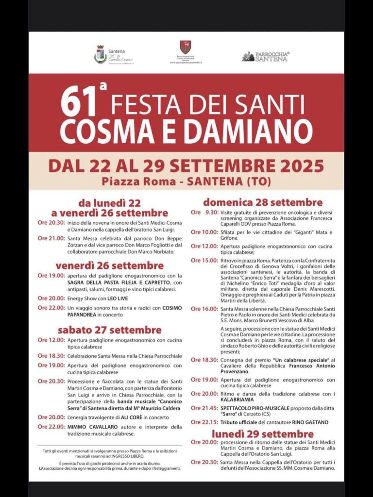 SANTENA. Dal 22 al 29 settembre Festa dei Santi “COSMA E DAMIANO”