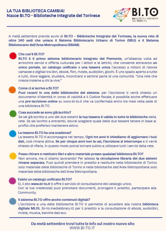 A metà settembre prende avvio BI.TO – Biblioteche Integrate del Torinese, la nuova rete di oltre 140 sedi che unisce il Sistema Bibliotecario Urbano di Torino (SBU) e il Sistema Bibliotecario dell’Area Metropolitana (SBAM). In occasione della quattordicesima Settimana nazionale delle biblioteche e della nascita della nuova rete Bi.TO (Biblioteche Integrate del Torinese), le biblioteche dell’Area sud-est organizzano numerose iniziative incentrate su momenti di lettura per adulti e bambini.