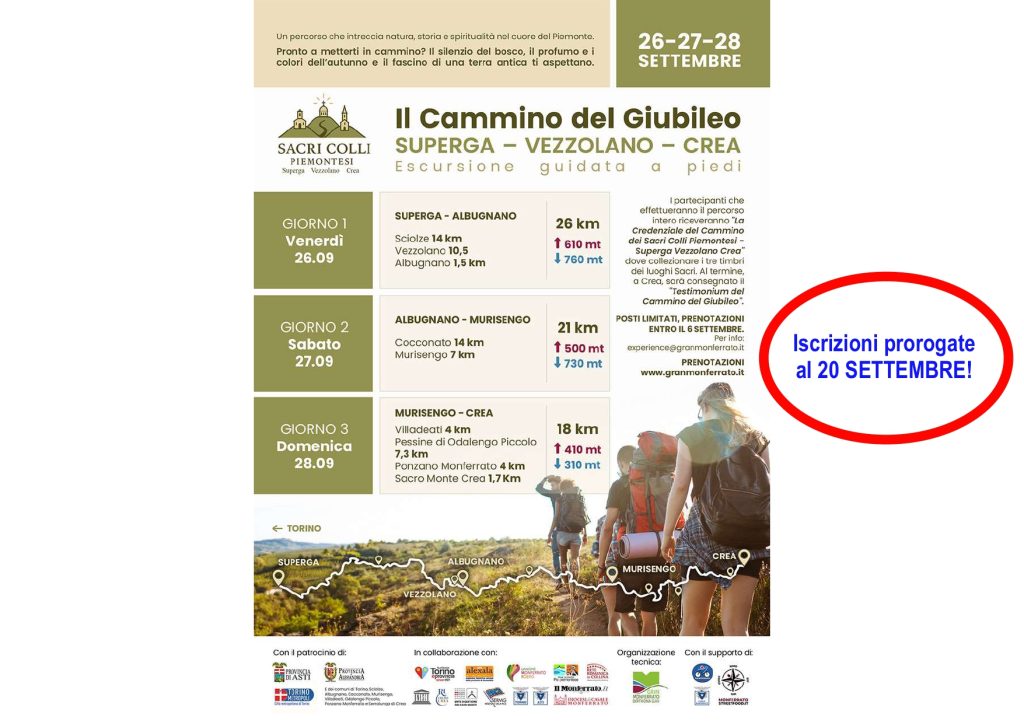 C’è tempo sino a sabato 20 settembre per iscriversi all’evento dedicato al Cammino sui Sacri Colli delle Colline del Po, organizzato in occasione del Giubileo della Speranza della FIAB Monferrato e dalla sezione del CAI di Casale Monferrato, che propongono di percorrere l’itinerario Superga-Vezzolano-Crea, incentrato su tre importanti monumenti religiosi e ideato nel 1990 da Cesare Triveri, socio del CAI di Casale Monferrato. L’itinerario è incluso nel patrimonio escursionistico della Regione Piemonte per iniziativa di un ampio partenariato tra enti locali e CAI, coordinato dalla Città metropolitana di Torino.