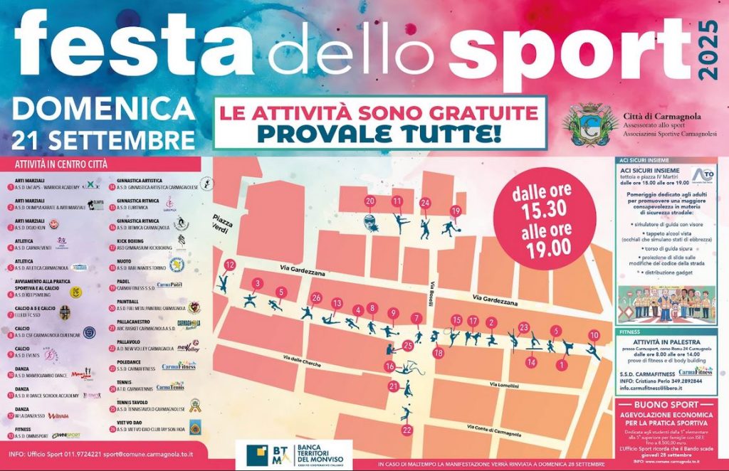 Domenica 21 settembre Carmagnola ospita una giornata ricca di iniziative gratuite che uniscono sport, benessere e prevenzione, animando le piazze e le vie del centro. Due gli appuntamenti principali: la sesta edizione della Festa dello Sport, che coinvolge sino ad ora 26 associazioni sportive locali, e l’evento “ACI Sicuri Insieme” dedicato alla sicurezza stradale, in particolare per la popolazione adulta e over 65.