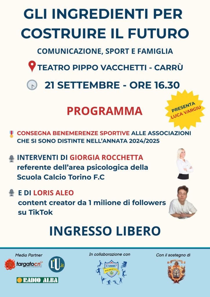 Domenica 21 Settembre, alle ore 16,30, a Carrù, presso il cinema teatro F.lli Vacchetti, si terrà l’evento “Gli ingredienti per costruire il futuro: comunicazione, sport e famiglia”, organizzato dal Comune di Carrù in collaborazione con la Polisportiva Comunale e con media partner TargatoCN, l’Unione Monregalese e Radio Alba.