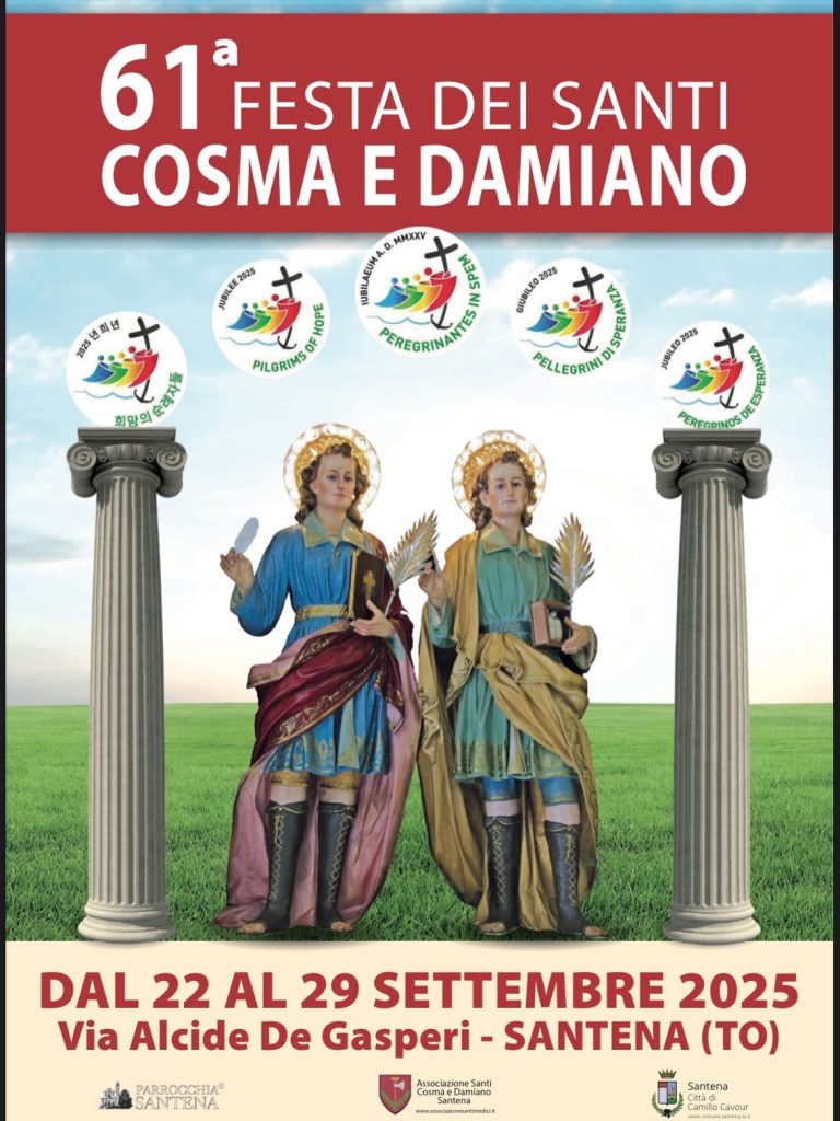 Ore 20.30: processione e fiaccolata con le statue dei Santi Martiri Cosma e Damiano con partenza dall’Oratorio San Luigi e arrivo in Chiesa parrocchiale, con la partecipazione della banda musicale “Canonico Serra” di Santena diretta dal M° Maurizio Caldera;