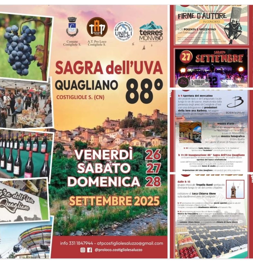 COSTIGLIOLE SALUZZO. Dal 26 al 28 settembre “Sagra dell’uva QUAGLIANO”.