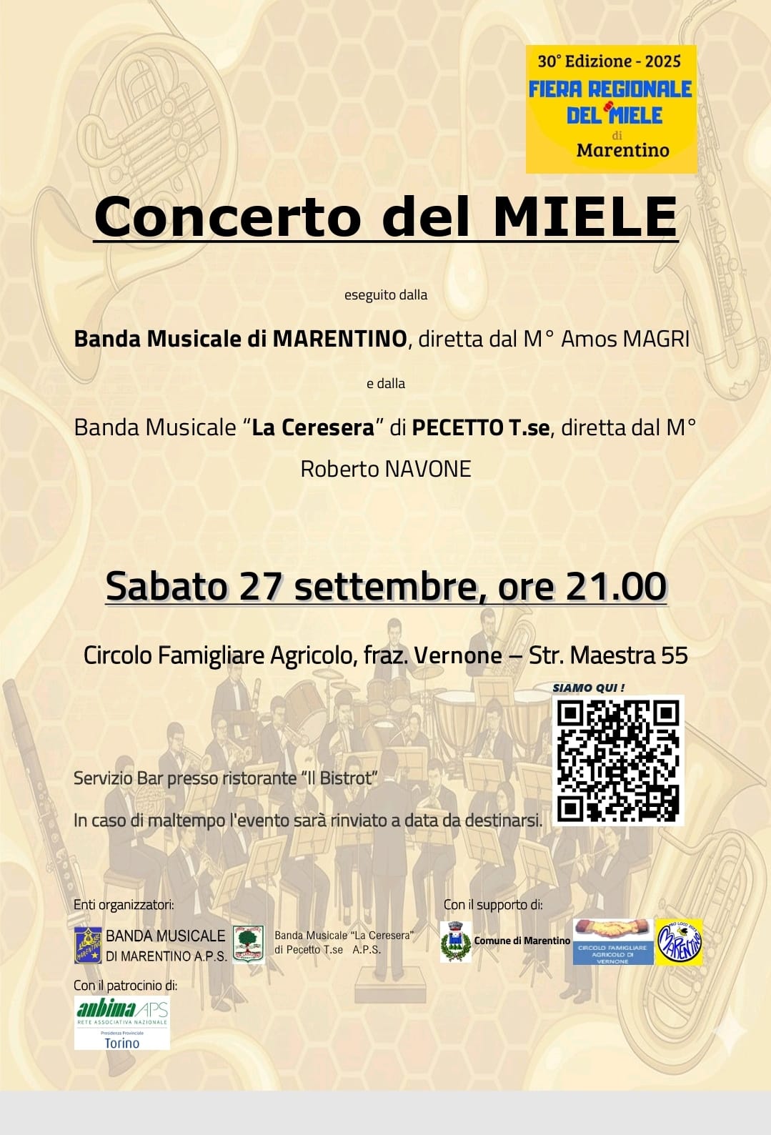 MARENTINO – VERNONE. Sabato 27 settembre “Concerto del MIELE” con la banda musicale di Marentino