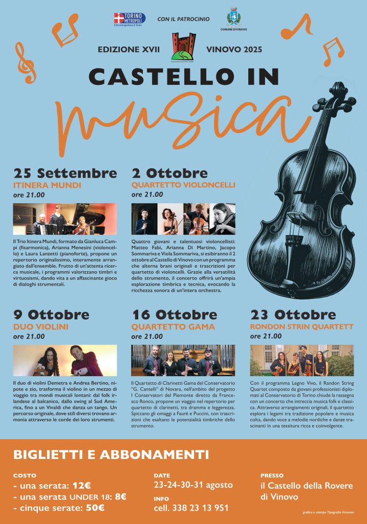 Nelle splendide sale del maniero di Vinovo, che appartenne alla famiglia Della Rovere, tornano nei giovedì sera dal 25 settembre al 23 ottobre i concerti della rassegna “Castello in Musica”, patrocinata dalla Città metropolitana di Torino.