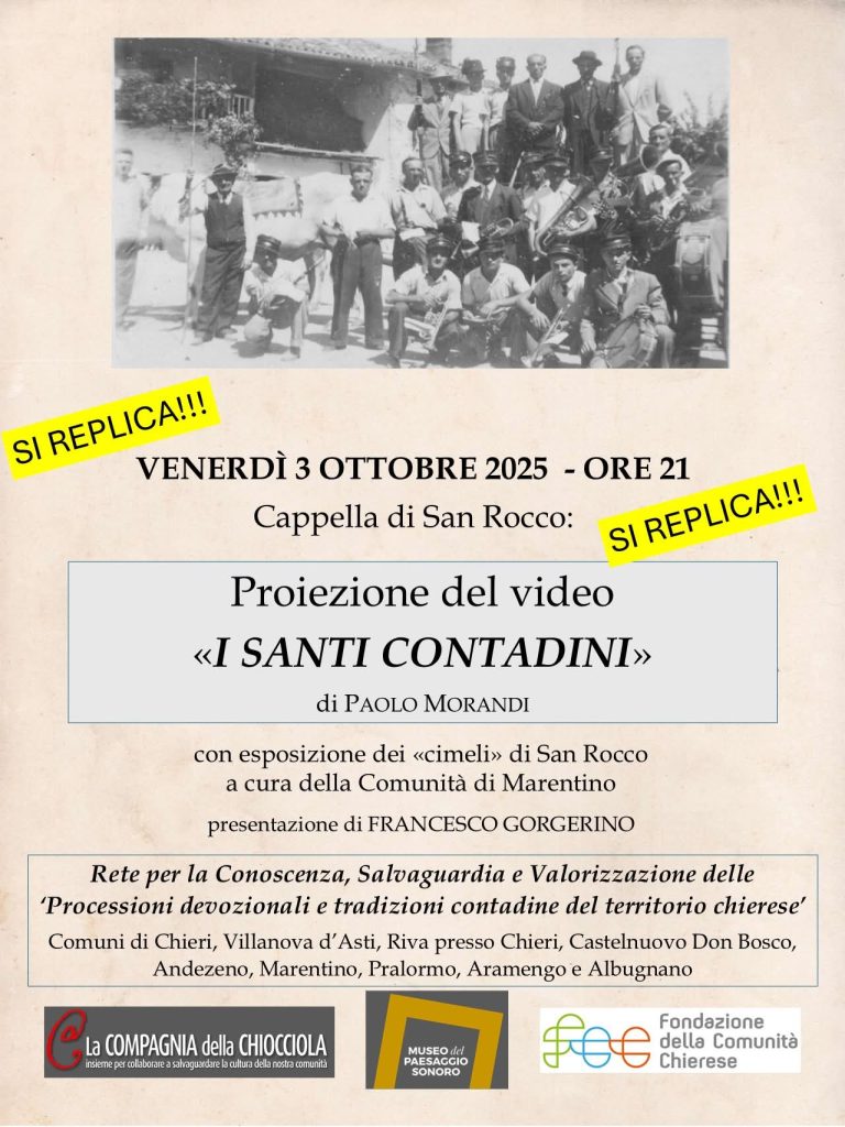 Negli scorsi mesi, Marentino ha aderito alla “Rete per la Conoscenza, Salvaguardia e Valorizzazione delle processioni devozionali e tradizioni contadine del territorio chierese“, lanciata dalla Compagnia della Chiocciola e dal Museo del Paesaggio Sonoro, con il sostegno della Fondazione della Comunità chierese. Ad oggi hanno aderito alla Rete i Comuni di Chieri, Poirino, Villanova d’Asti, Riva presso Chieri, Castelnuovo Don Bosco, Buttigliera d’Asti, Andezeno, Pralormo, Marentino, Aramengo e Albugnano, con lo scopo di riscoprire e valorizzare il patrimonio culturale e identitario connesso alla religiosità popolare contadina.