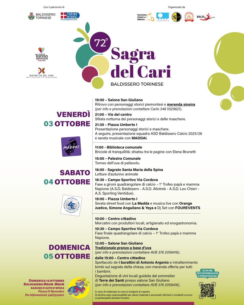 Da venerdì 3 a domenica 5 ottobre la 72ª Sagra del Cari di Baldissero Torinese celebra un’eccellenza vitivinicola locale, il vino che è noto anche come Pelaverga ed è uno dei simboli delle colline torinesi, raro, pregiato, frutto di una lunga storia e di una produzione limitata. La sagra offre ai visitatori l’opportunità di immergersi nelle tradizioni locali, tra il mercato diffuso, eventi culturali e momenti di convivialità; il tutto circondato dalla bellezza delle colline e del patrimonio enogastronomico piemontese. Il programma completo dell’evento, patrocinato dalla Città metropolitana di Torino, è pubblicato nel sito Internet dell’Associazione Volontari Baldissero alla pagina www.avbaldissero.it/sagra-dell-uva-cari/#programma