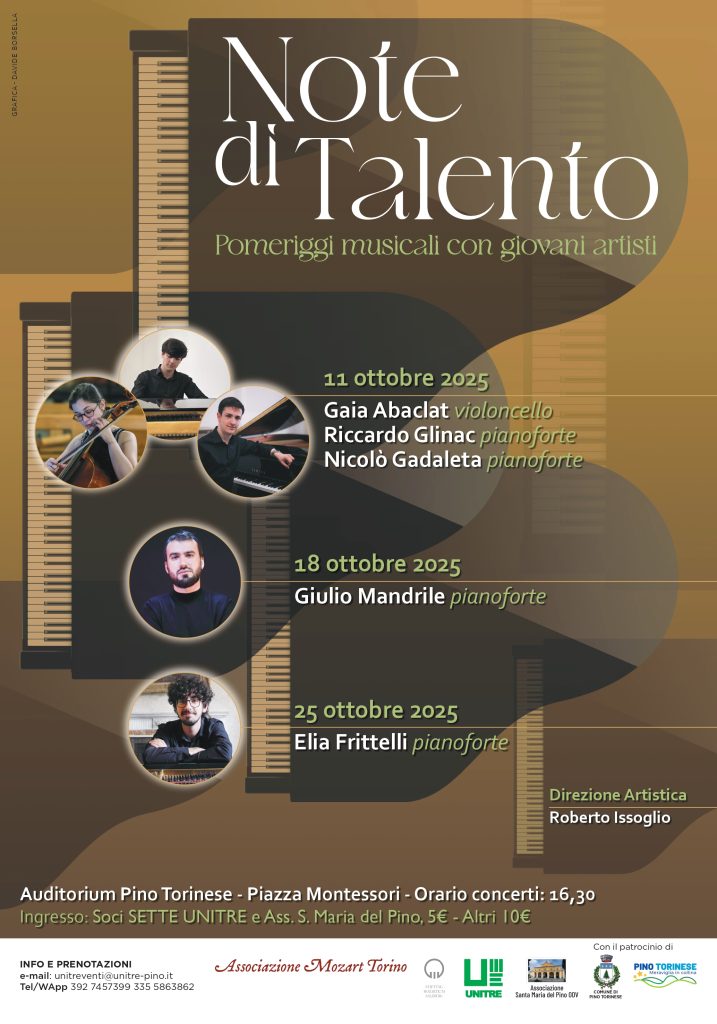 Nel mese di ottobre, a Pino Torinese, arriva “Note di Talento”, la rassegna organizzata dall’Associazione Mozart Torino in collaborazione con l’Unitre Pino Torinese e l’Associazione Santa Maria del Pino, con il patrocinio del Comune di Pino Torinese. La direzione artistica è affidata al Maestro Roberto IssoglioTre pomeriggi all’insegna della grande musica con protagonisti giovani interpreti di straordinaria sensibilità: la violoncellista Gaia Abaclat e i pianisti Riccardo Glinac, Nicolò Gadaleta, Giulio Mandrile ed Elia Frittelli.I concerti si terranno sabato 11, 18 e 25 ottobre 2025 presso l’Auditorium del Centro Polifunzionale (Piazza Montessori), alle ore 16:30.