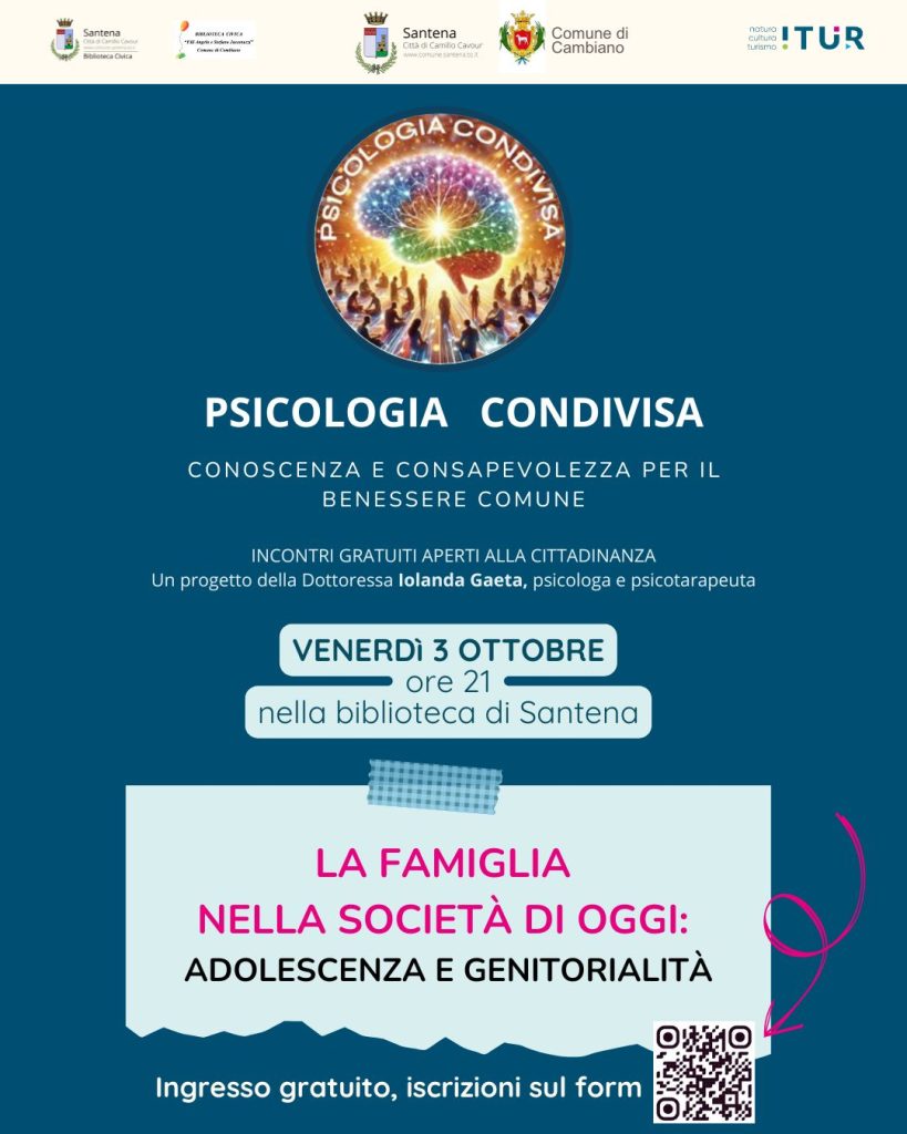 Gli incontri di Psicologia Condivisa 2025, curati dalla dottoressa Iolanda Gaeta, psicologa e psicoterapeuta, proseguono sul territorio chierese.   L’appuntamento è per venerdì 3 ottobre alle 21 nella sala della Biblioteca Civica “E. Marioni” in Piazza Visconti Venosta 1 a Santena.   Il tema dell’incontro sarà “La famiglia nella società di oggi: adolescenza e genitorialità”.   La famiglia è profondamente cambiata in questi ultimi decenni, trasformando legami, ruoli e responsabilità educative. Dai modelli tradizionali si è passati a forme più flessibili e affettivamente vicine, con vantaggi ma anche nuove fragilità che incidono sulla crescita degli adolescenti. L’incontro affronterà il significato odierno dell’essere genitori e figli, le differenze rispetto al passato e le nuove forme di disagio giovanile, depressione, disturbi alimentari, dipendenze, intese come linguaggi attraverso cui i ragazzi esprimono il proprio malessere.   Sarà inoltre discusso il ruolo degli adulti nel sostenere i figli, recuperando autorevolezza e fiducia, anche attraverso il modello del Lighthouse Parenting che propone il genitore come punto di riferimento stabile e credibile.   Sarà un’occasione di confronto e condivisione per aiutare i genitori a sentirsi più sicuri e competenti nella relazione con i propri figli.   L’evento si svolgerà in modo diretto e dinamico, così da favorire partecipazione e dialogo. L’incontro è aperto e libero a tutti, con iscrizione consigliata. È possibile confermare la propria presenza scrivendo all’indirizzo mail psicologiacondivisa25@gmail.com.