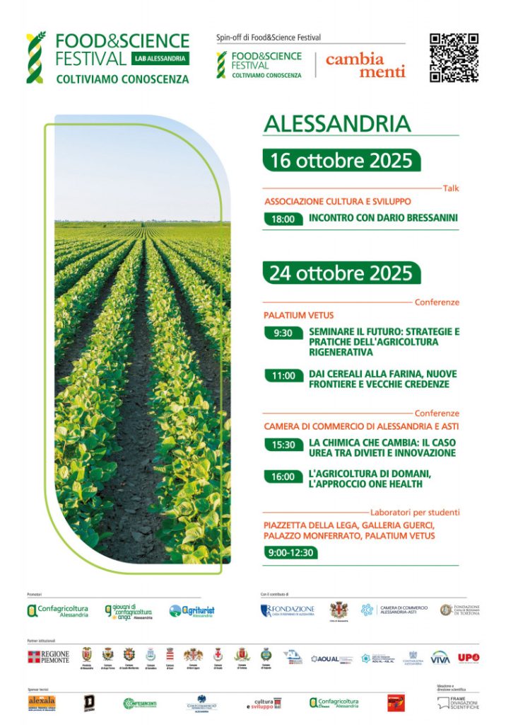Anche nel 2025 l’intento degli organizzatori – Confagricoltura Alessandria con Anga Alessandria e Agriturist Alessandria, la supervisione scientifica di Frame Divagazioni Scientifiche, con il sostegno della Fondazione Cassa di Risparmio di Alessandria, del Comune di Alessandria, della Camera di Commercio di Alessandria e Asti, della Fondazione Cassa di Risparmio di Tortona, gli sponsor tecnici e gli enti che hanno concesso il patrocinio – è quello di proporre in provincia di Alessandria il format legato al festival mantovano. Alessandria entra così a fare parte del circuito delle città toccate dal Festival e dai Lab, insieme a Ferrava, Parma, Rovigo, Modena, Bergamo e Udine, unica città del Piemonte ad ospitare l’evento consolidato di divulgazione scientifica.