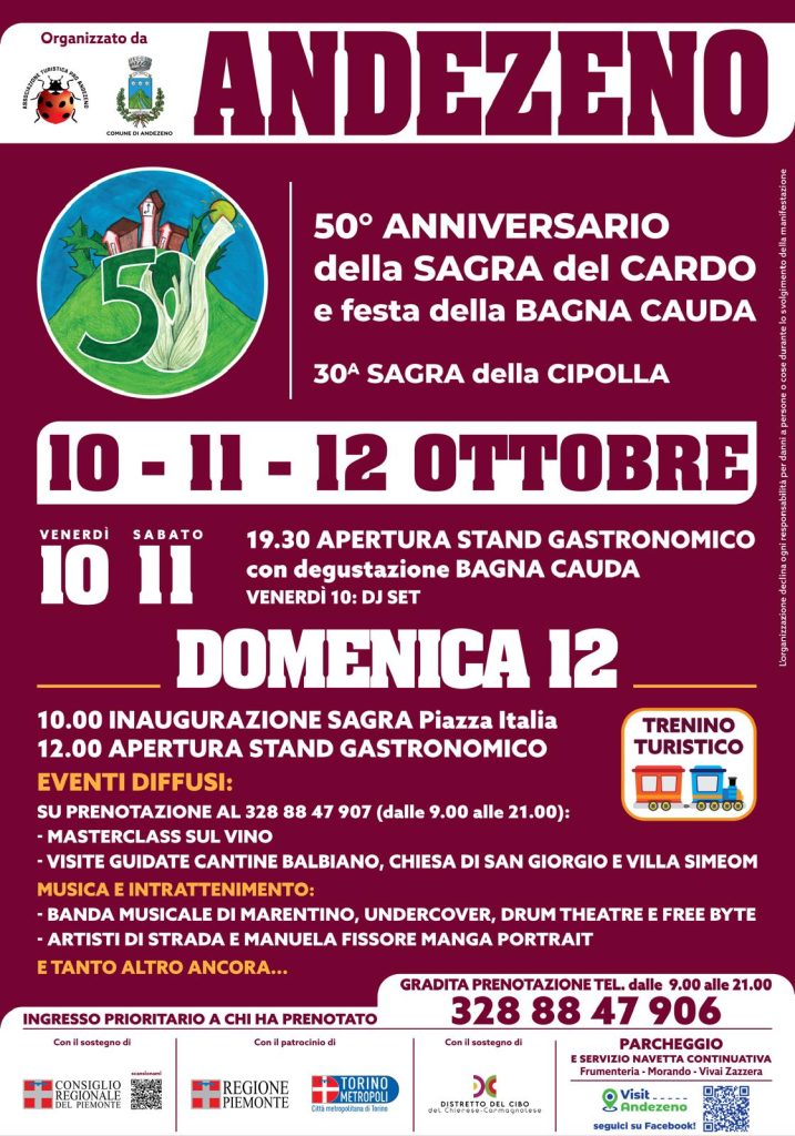 Da venerdì 10 a domenica 12 ottobre in piazza Italia ad Andezeno sono in programma la cinquantesima edizione della Sagra del Cardo e Festa della Bagna Caôda e la trentesima Festa della cipolla. I visitatori troveranno una mostra mercato dedicata ai cardi e alle cipolle piattelline e uno stand gastronomico per la degustazione della bagna caôda, aperto il venerdì e il sabato sera a partire dalle 19,30 e la domenica dalle 12 in avanti. L’inaugurazione ufficiale è in programma domenica 12 alle 10. Masterclass dedicate al vino e visite guidate alla Cantina Balbiano, alla chiesa di San Giorgio e a Villa Simeom. In programma anche intrattenimenti musicali ed esibizioni di artisti di strada.