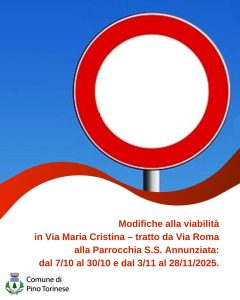 A Pino Torinese, per l’esecuzione dei lavori di riqualificazione di Via Roma, dal giorno 7/10/2025 al giorno 31/10/2025 e dal giorno 03/11/2025 al giorno 28/11/2025 sarà vietata la circolazione veicolare in Via Maria Cristina, nel tratto da Via Roma alla Parrocchia S.S. Annunziata, ad eccezione dei cittadini che hanno accesso carraio nella parte in cui sussiste il divieto, dei mezzi di soccorso, di pronto intervento e del servizio di nettezza urbana, che potranno transitare a doppio senso con accesso e uscita in direzione Via Martini / Via Camandona.