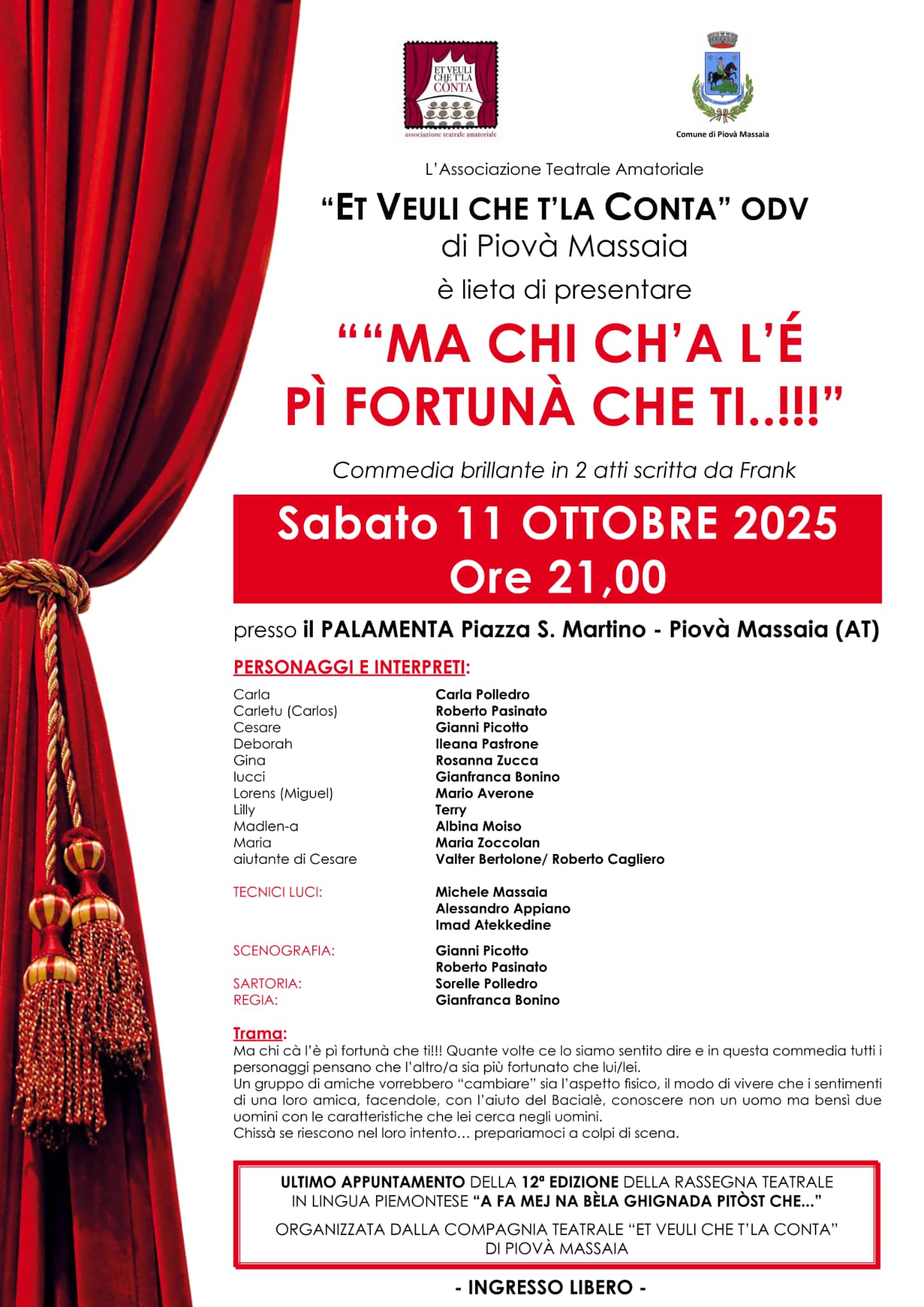 PIOVA’ MASSAIA. Sabato 11 ottobre si conclude la rassegna teatrale in lingua piemontese con la commedia “MA CHI CH’A L’ E’ PI’ FURTUNA’ CHE TI…!!! “