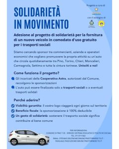 Si ricorda a commercianti, aziende e attività locali che è possibile aderire a “Solidarietà in movimento”, il progetto che garantisce l’utilizzo di un nuovo veicolo per il trasporto sociale.