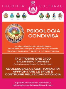 Penultimo incontro 2025 del percorso di “Psicologia Condivisa” promosso dai Comuni della Collina Torinese – Andezeno, Arignano, Baldissero Torinese, Marentino, Mombello, Montaldo Torinese, Moriondo Torinese e Pavarolo – e nato da un’idea della dottoressa Iolanda Gaeta, psicologa e psicoterapeuta. Il quarto incontro del ciclo si terrà venerdì 17 ottobre alle 21 al Centro Comunale Paluc di Baldissero Torinese in Via Pino Torinese 1, e avrà come titolo “Adolescenza e Genitorialità: affrontare le sfide e costruire relazioni di fiducia”. La serata sarà dedicata a una riflessione sulla complessità del legame tra genitori e adolescenti, entrambi coinvolti in profondi processi di trasformazione all’interno di una realtà segnata da cambiamenti rapidi e certezze fragili. Cambia il ruolo del genitore chiamato a sostenere, orientare e mantenere una funzione di contenimento capace di pensiero e presenza; l’adolescente è impegnato nel compito di differenziarsi, di costruire la propria identità e di affermare un sé autonomo in un mondo in continua ridefinizione. Questi movimenti, pur distinti per natura e finalità, possono incontrarsi in una dimensione relazionale dove la crescita dell’uno diventa condizione per la crescita dell’altro. L’incontro si propone di esplorare tale dinamica in una prospettiva evolutiva e trasformativa offrendo uno spazio di pensiero condiviso e un ampio momento di confronto e dialogo con i partecipanti. L’evento è gratuito ed aperto a tutti. All’incontro è gradita una prenotazione via mail a psicologiacondivisa25@gmail.com. Il ciclo di incontri 2025 di Psicologia Condivisa si concluderà venerdì 28 novembre a Pavarolo al Centro Famiglia Araba Fenice.