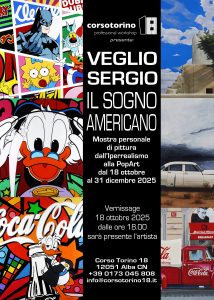 Corso Torino 18 Professional Workshop propone per l’autunno 2025 un percorso espositivo dedicato all’artista torinese Sergio Veglio, una mostra dal titolo “IL SOGNO AMERICANO, visioni a pennello in CORSOTORINO18” attraverso le opere di Iperrealismo passando dalla produzione PopArt, concludendo con l’esposizione delle nuove opere prodotte in esclusiva per il mercato americano.