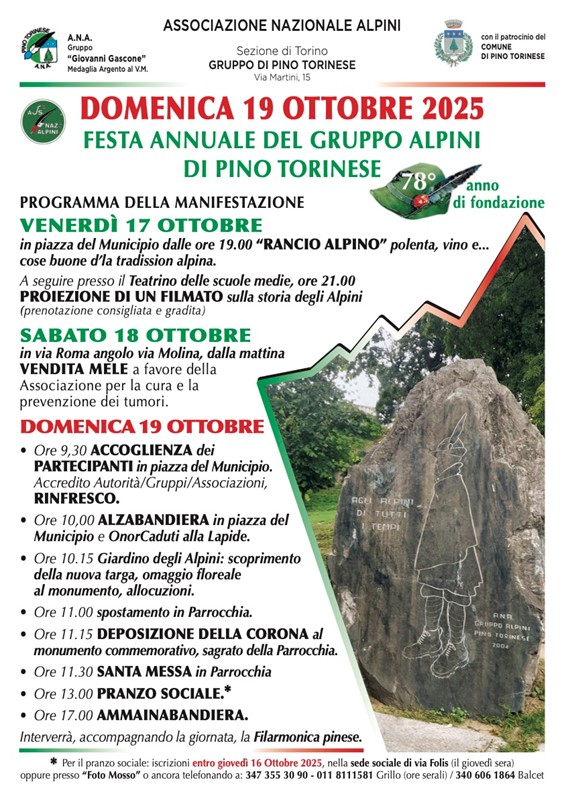Da Venerdì 17 e fino a Domenica 19 ottobre si svolgeranno le iniziative promosse dal Gruppo Alpini di Pino Torinese per celebrare la propria festa annuale.