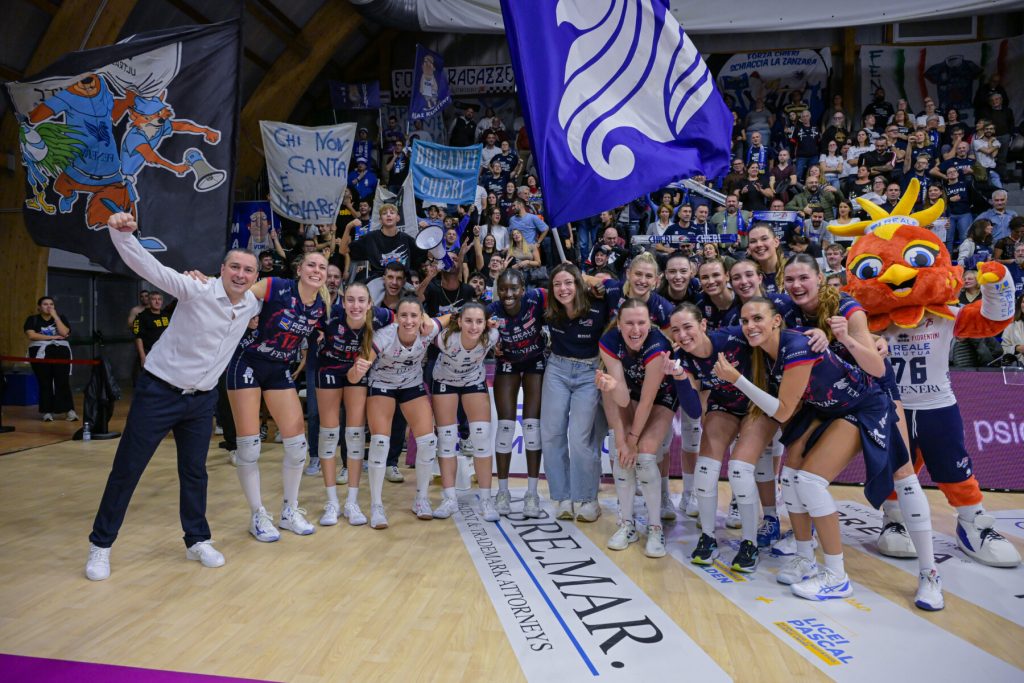Terzo set – Nemeth, Van Aalen e Gray portano rapidamente Chieri sul 6-1. Da 11-5 su servizio di Eze le orobiche dimezzano il distacco (11-8). Nervini sblocca le biancoblù (12-8), quindi Dervisaj, Gray e Van Aalen firmano un nuovo allungo (15-9). Il vantaggio locale tocca il massimo di 11 punti quando su servizio di Van Aalen Gray mura Mlejnkova (21-10). Negro inserisce Bah al posto di Dervisaj e Lotti al posto di Nervini regalando il debutto alle due schiacciatrici; sul 23-13 entra anche Ferrarini. Lotti chiude il 24-14 regalando dieci palle match a Chieri, che chiude poi al primo tentativo grazie all’attacco lungo di Bolzonetti.