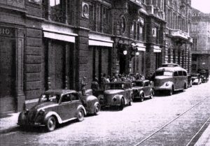 Giornalisti e tecnici in partenza per il fronte alpino dal palazzo direzionale dell’Eiar in via Arsenale 21 a Torino (immagine da “Radiocorriere” n. 28 – 1940)