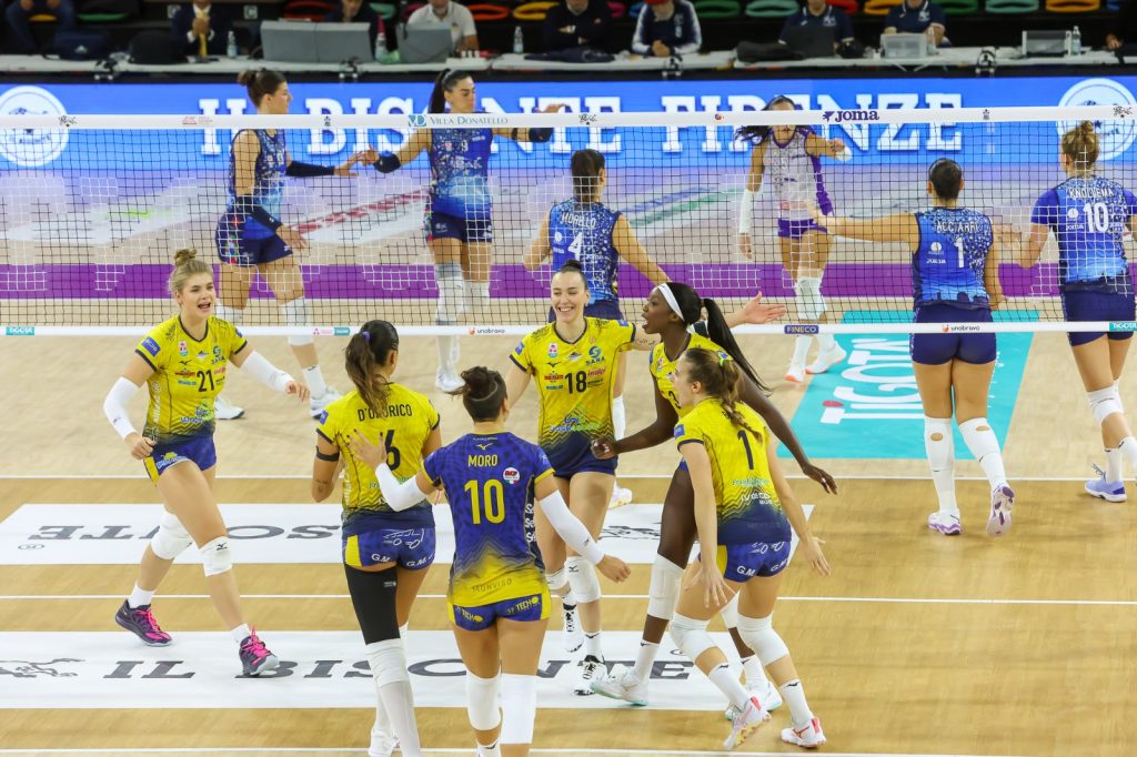 5 SET | Ace di Bukilic per il 3-2. Pareggia i conti il primo tempo di Dodson. Si prosegue punto a punto, al cambio campo Firenze è avanti 8-7.  Il primo allungo è delle piemontesi che, con Davyskiba in pipe salgono in doppio vantaggio (8-10). Dodson mura Acciarri per il 9-13. Con le unghie e con i denti Bussoli e compagne difendono il vantaggio, Villani annulla il primo match point ma D’Odorico piazza il 12-15 chiudendo la gara.