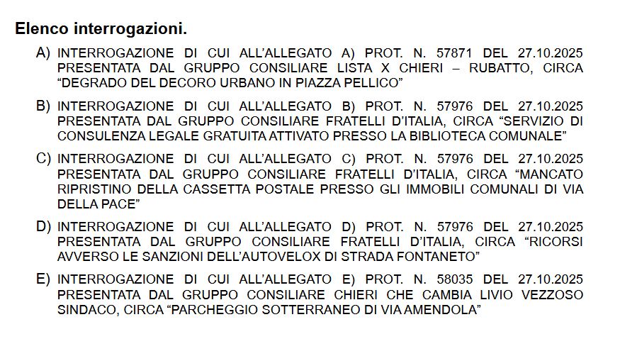 Chieri. Consiglio Comunale convocato lunedì 3 novembre. Ecco l’ordine del giorno
