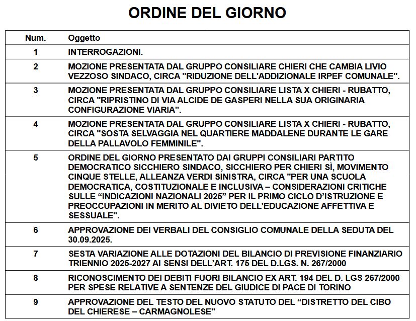 E’ convocato per lunedì 3 novembre, con prosecuzioni lavori martedì 4, alle 19,45, il consiglio comunale di Chieri.