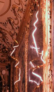 Negli spazi aulici l’esperienza è opposta: le opere si mimetizzano con gli stucchi dorati, le specchiere e i grandi arazzi sfidando l’occhio a essere scoperte. Per ciascuna delle sei sale del piano nobile Ferdi Giardini plasma, senza farsi intimorire, una composizione capace di dialogare sottovoce con le tante meraviglie cariche di storia. Trovare Neutrini stabilizzati o Impulsi è ardua impresa fino a quando non rivelano la loro anima luminosa.