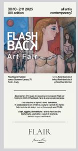 All’interno della tredicesima edizione di FLASHBACK – ALL ART IS CONTEMPORARY – ART FAIR, la galleria FLAIR presenta Geometrie, un progetto realizzato in collaborazione con Archivio Samartino. Corposa la selezione di dipinti di Edoardo Perrone di San Martino – in arte Samartino – che affianca un gruppodi sculture e alcuni arredi di design, per raccontare come l’arte della seconda metà del ‘900 rilegge ilgeometrico. Non certo per ingabbiare in un concetto rigido corpi, oggetti e architetture; piuttosto perrestituire memoria, storia e sentimento a forme e volumi che si modificano, si evolvono.Si animano dei nostri sogni e delle nostre paure.Geometria, sì, come studio dello spazio e delle figure, ma per uno spazio vitale, reale o immaginario che sia.Fluido, dischiuso, atemporale, in continuo fermento. In linea con la direzione artistica della fiera che ha sceltodi non attribuire un titolo alla edizione di quest’anno per fare di Flashback 2025 un luogo aperto, teatro diricerca e confronto.