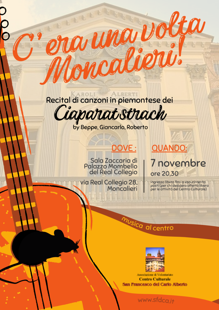Ecco il senso di “Cera una volta Moncalieri!”, recital di canzoni in piemontese dei “Ciaparat strach”: Beppe, Giancarlo e Roberto, ci accompagneranno in un intenso e divertente percorso attraverso tante canzoni con sullo sfondo la vecchia e nobile città del Proclama sotto lo “sguardo” austero del Real Collegio Carlo Alberto dei Padri Barnabiti, portando gli ascoltatori attraverso il tempo e il paesaggio delle città e dei territori del Piemonte.