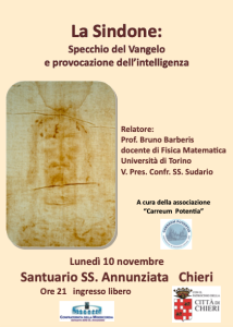 Lunedì 10 Novembre alle ore 21 nella sala Conferenze del Santuario SS. Annunziata di Chieri incontro con il Prof. Bruno Barberis: “La sindone, specchio del Vangelo e provocazione dell’intelligenza”.