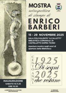 Nel centenario della nascita di Enrico Barberi, la famiglia dell’artista ne celebra la memoria con una mostra retrospettiva che pone particolare attenzione alla sua produzione litografica. Barberi, scultore, incisoree ceramista autodidatta, nacque a Castelletto Sopra Ticino cento annifa, e qui ha sempre vissuto e lavorato nella storica “casa rossa” di ViaOldrina, dove si è spento nel 2012.Pur essendo conosciuto soprattutto per le sue sculture in rame, avviatenegli anni Sessanta, la produzione grafica rappresenta una partesignificativa e coerente del suo percorso artistico. Ricercatoreinstancabile e appassionato studioso di reperti medievali econtemporanei, restauratore di opere di arte orafa, Barberi ha lavoratorame, oro, argento e acciaio attraverso le tecniche dello sbalzo, delcesello e dell’incisione. Con lo *sbalzo “a tutto tondo”* ha dato formaa grandi pannelli modellati a partire da semplici lastre, trasformandoil metallo in materia viva.Le litografie e le acqueforti presentate in questa occasione rivelano ladimensione più intima e poetica del suo lavoro: cavalli, cani, ballerineleggere, paesaggi e attimi quotidiani diventano immagini sospese,attraversate da una quiete essenziale. In esse emerge costantemente illegame profondo con la sua terra: il Ticino, le barche, la natura,insieme a una spiritualità silenziosa, discreta ma sempre presente.