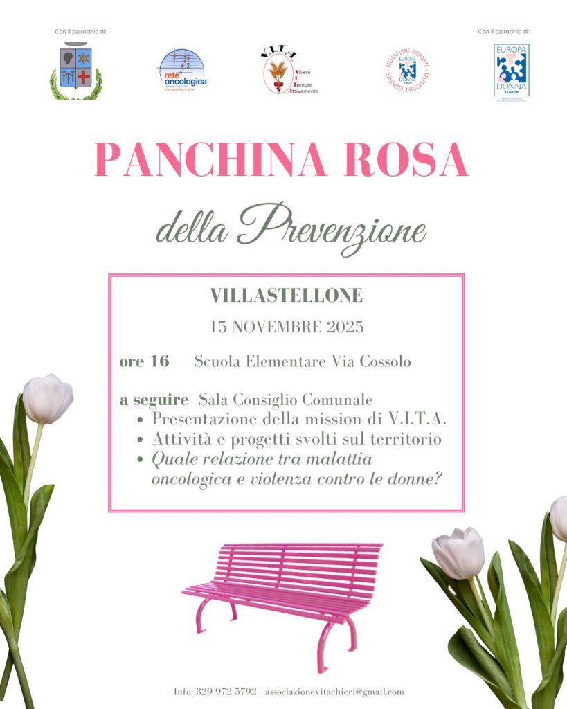 Sabato 15 novembre p.v. alle ore 16:00 presso la Scuola Elementare di Via Cossolo sarà inaugurata la panchina rosa di Villastellone, voluta dal Comune sensibile alle tematiche della salute e della prevenzione.