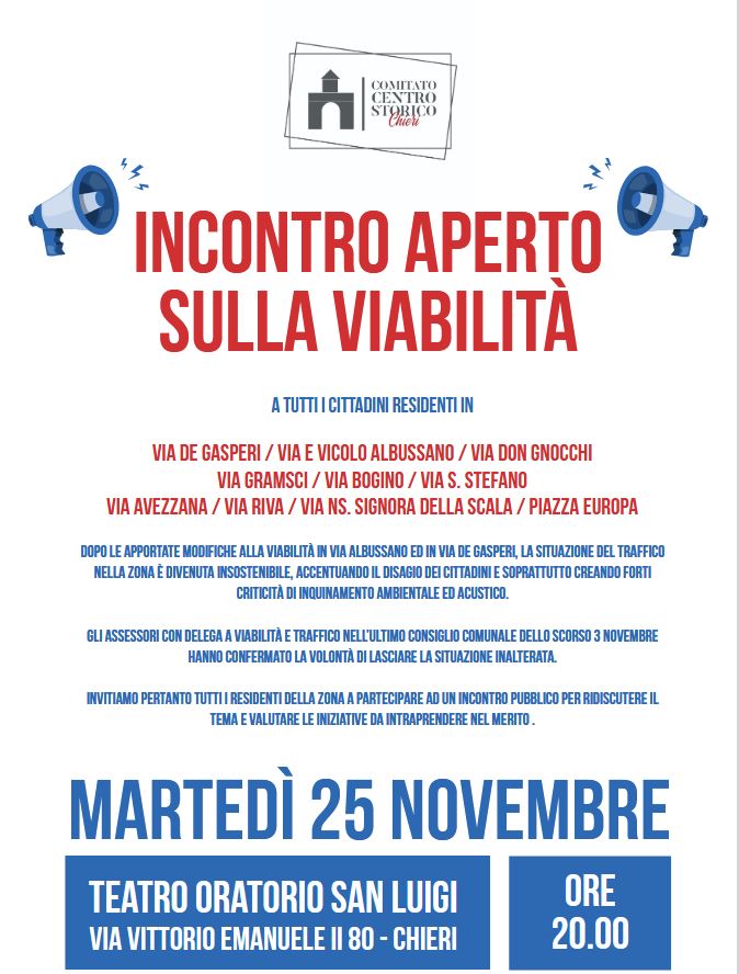 Chieri. Incontro aperto sulla mobilità promosso dal Comitato Centro Storico di Redazione · 13 Novembre 2025 I problemi di traffico nella zona di Via Albussano e Via Bogino al centro di un dibattito al teatro San Luigi martedì 25 novembre alle 20 Visto da: 245