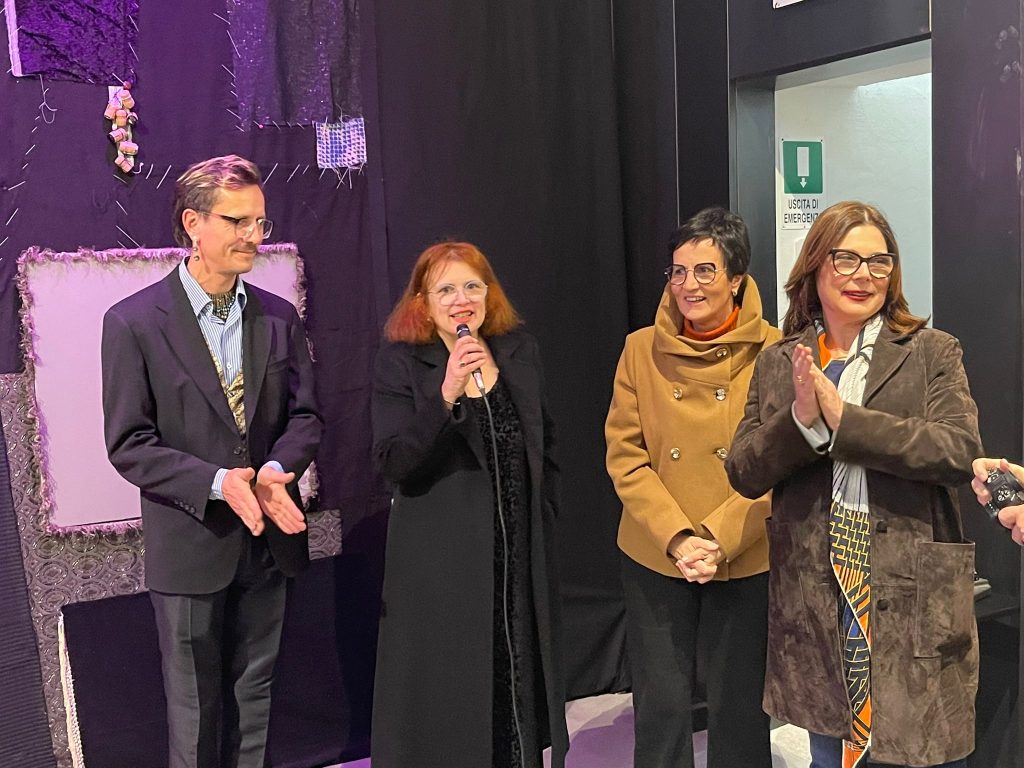 All’inaugurazione hanno partecipato la Presidente della Fondazione Melanie Zefferino, l’Assessora alla Cultura del Comune di Chieri Antonella Giordano e Laura Pompeo consigliere delegato della Regione Piemonte. La mostra, promossa dalla Fondazione Chierese per il Tessile e per il Museo del Tessile con il sostegno del Comune di Chieri e della Regione Piemonte, raccoglie venti opere tra dipinti a olio, costumi teatrali e una monumentale installazione site‑specific realizzata con scarti di tessuto denim, luci e suoni.