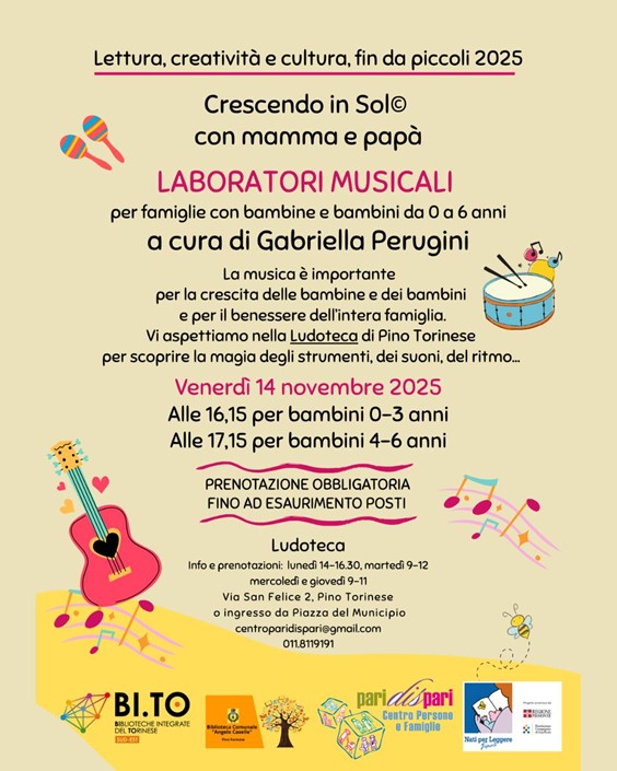 Pino Torinese. Venerdì 14 novembre “Laboratori musicali” per bimbi e bimbe in Ludoteca Comunale