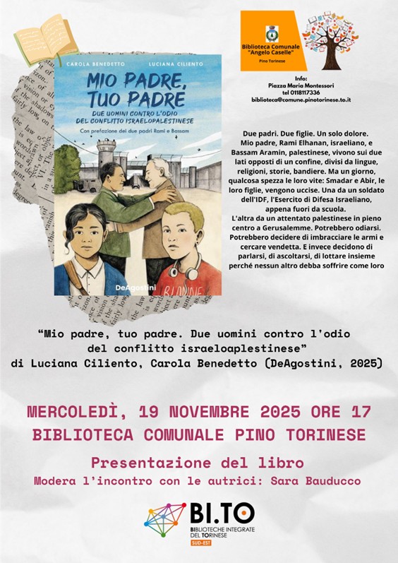 Mercoledì 19 novembre alle ore 17:00 in biblioteca, la presentazione del libro “Mio padre, tuo padre. Due uomini contro l’odio del conflitto israelopalestinese” di Carola Benedetto e Luciana Ciliento.