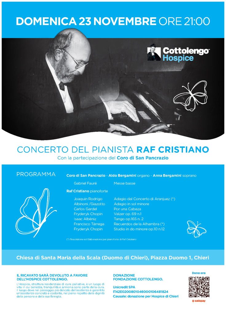 Chieri. In Duomo concerto per l’Hospice del Cottolengo con il pianista Raf Cristiano di Redazione · 19 Novembre 2025 Il concerto del pianista Raf Cristiano per raccogliere fondi a favore dell’Hospice Cottolengo di Chieri Visto da: 62