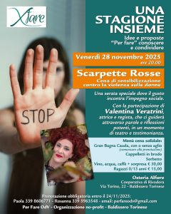 Venerdì 28 novembre, all’osteria Alfiere Cooperativa di Rivodora di via Torino 22 a Baldissero Torinese, si terrò l’iniziativa “Scarpette Rosse”, cena di sensibilizzazione contro la violenza sulle donne.Sarà presente l’attrice e regista Valentina Veratrini, che guiderà e coinvolgerà i presenti attraverso parole e riflessioni in un momento di testimonianza e di teatro.La prenotazione è obbligatoria entro il 24 novembre e può essere effettuata chiamando Paola al 339 8606771 o Rosanna al 3395963548: possibile anche utilizzare l’indirizzo e mail perfareodv@gmail.com..