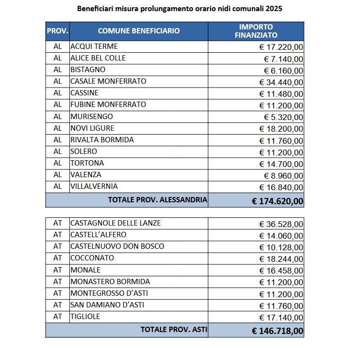 L’assessorato a Istruzione e merito della Regione Piemonte ha destinato oltre 1,2 milioni di euro che permetteranno a 74 Comuni di attivare il prolungamento dell’orario di apertura in circa 100 asili nido comunali, mantenendo invariate le tariffe per le famiglie. I costi sono infatti interamente coperti dalla Regione, grazie alle risorse del Fondo Sociale Europeo Plus 2021-2027.