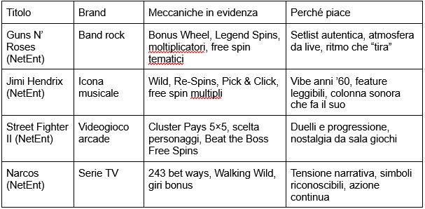 Cinema, calcio e musica sono lingua franca. Un logo azzeccato o un motivetto cantabile vale più di dieci righe di regolamento. Nelle branded slots l’iconografia pop entra in gioco: maglie storiche, poster da videoteca, riff che si canticchiano in coda al bar. Quando la licenza è ufficiale, simboli, colonne sonore e personaggi possono comparire fedeli all’originale: niente imitazioni, tutto filato dritto al punto. E sì, chi in passato le ha liquidate come “puro marketing” dovrebbe correggere il tiro: qui c’è design, regole chiare e feature che pesano sul gameplay, non solo trucco e parrucco.