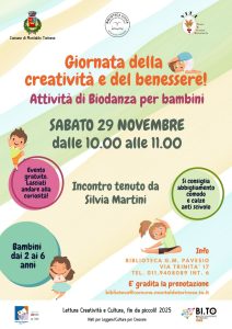 La Biodanza è un’attività di movimento che integra il corpo, la mente e le emozioni utilizzando musica, movimento ed esercizi di gruppo per favorire il benessere psico-fisico e lo sviluppo personale.   Questa è la proposta della Biblioteca Civica “Giuseppe Matteo Pavesio” di Montaldo Torinese. L’incontro si terrà sabato 29 novembre alle 10 nella Sala Convegni Silvio Geuna del Municipio di Montaldo in via Trinità 17. L’incontro è rivolto in particolare ai bambini e bambine tra gli 2 e i 6 anni, accompagnati dai loro fratelli e sorelle, anche di età superiore, e dai genitori.   La biodanza è un’attività di movimenti suggeriti da musiche specifiche.   La biodanza con i bambini si presenta come attività ludica. È un invito a danzare la vita, valorizzando tutti gli aspetti positivi, in armonia con chi ci sta vicini e con la natura che ci circonda.   Uno dei punti particolarmente significativi della biodanza nei bambini e ragazzi è l’educazione affettiva ossia la capacità di vedere, riconoscere, rispettare la vita di chi ci sta intorno e di tutti i viventi.   L’attività è sempre svolta in gruppo, mai in forma individuale. È un percorso ciclico di durata variabile. Silvia Martini, facilitatrice di biodanza, è specializzata in questa attività rivolta a bambini e adolescenti.   L’incontro è libero; per ulteriori informazioni, potete mettervi in contatto con la biblioteca mercoledì dalle 15 alle 18 – tel. 011.940.80.89 interno 6 – oppure scrivere alla mail biblioteca@comune.montaldotorinese.to.it.