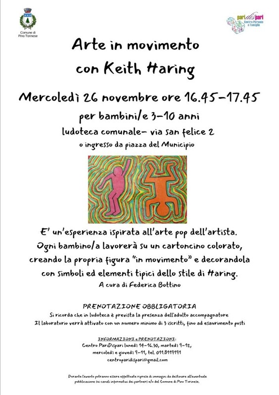 A Pino Torinese, Mercoledì 26 novembre, in Ludoteca, si terrà il laboratorio creativo “Arte in movimento”, ispirato all’arte pop di Keith Haring. Per bimbe/i 3-10 anni.