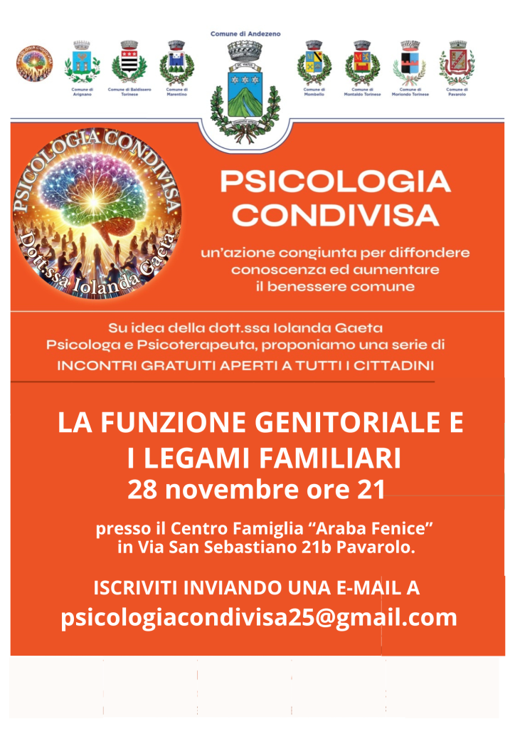 Gli incontri di quest’anno del percorso di “Psicologia Condivisa” promossi dai Comuni della Collina Torinese – Andezeno, Arignano, Baldissero Torinese, Marentino, Mombello, Montaldo Torinese, Moriondo Torinese e Pavarolo – e nato da un’idea della dottoressa Iolanda Gaeta, psicologa e psicoterapeuta, si concludono venerdì 28 novembre alle 21 a Pavarolo al Centro Famiglia Araba Fenice in Via San Sebastiano 21 b, e avrà come titolo “La Funzione Genitoriale e i Legami Familiari”. La serata sarà dedicata a uno dei temi più delicati e profondi della vita familiare: il modo in cui si diventa genitori e il modo in cui i legami familiari prendono forma, cambiano, si trasformano. Parleremo di ciò che sostiene la relazione con i figli, di ciò che la rende stabile o fragile e di come la storia emotiva di ogni adulto influenzi il modo di stare dentro la relazione con il bambino. Uno spazio per pensare insieme al ruolo che la famiglia svolge nella crescita emotiva, alla complessità dei sentimenti che attraversano la genitorialità e al modo in cui ciascuno può costruire una presenza che sostiene, contiene e permette di crescere. Un’occasione per comprendere meglio dinamiche che spesso si vivono senza piena consapevolezza, e per dare voce a ciò che accade nei legami che accompagnano il cammino dall’infanzia all’adolescenza. L’evento è gratuito ed aperto a tutti. All’incontro è gradita una prenotazione via mail a psicologiacondivisa25@gmail.com.