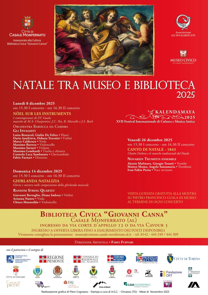 Prenderà il via lunedì 8 dicembre 2025 Natale tra Museo e Biblioteca, in continuità con Natale al Museo, che giungerebbe alla sua la XIV edizione, la rassegna di concerti ideata da Fabio Furnari e promossa dall’Associazione Gli Invaghiti ETS in collaborazione con l’Assessorato alla Cultura e il Museo Civico – Gipsoteca Bistolfi di Casale Monferrato che che permetterà di unire l’ascolto musicale alla scoperta delle collezioni cittadine con l’obiettivo di supportare la valorizzazione e la divulgazione al vasto pubblico del ricco patrimonio culturale cittadino.