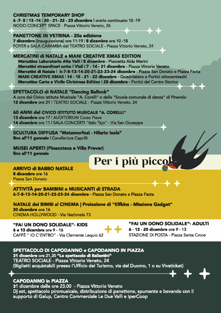 Accanto al percorso luminoso, la città offrirà un ricco calendario di appuntamenti. Torna la storica “Panettone in Vetrina” (7 e 8 dicembre) al Teatro Sociale, insieme ai numerosi mercatini di Natale: il Mercatino del Laboratorio Alte Valli (8 dicembre) in Piazzetta Alda Merini, i mercatini straordinari sotto i Viali (7, 14, 21 dicembre) e i Mercatini di Natale (6/7/8, 13/14 e dal 20 al 24 dicembre) in Piazza San Donato e Piazza Facta.A questi si aggiunge “Mani Creative – Xmas Edition (14/15 e 21/22 dicembre)”, che porterà hobbisti e artigiani locali sotto i portici ottocenteschi.
