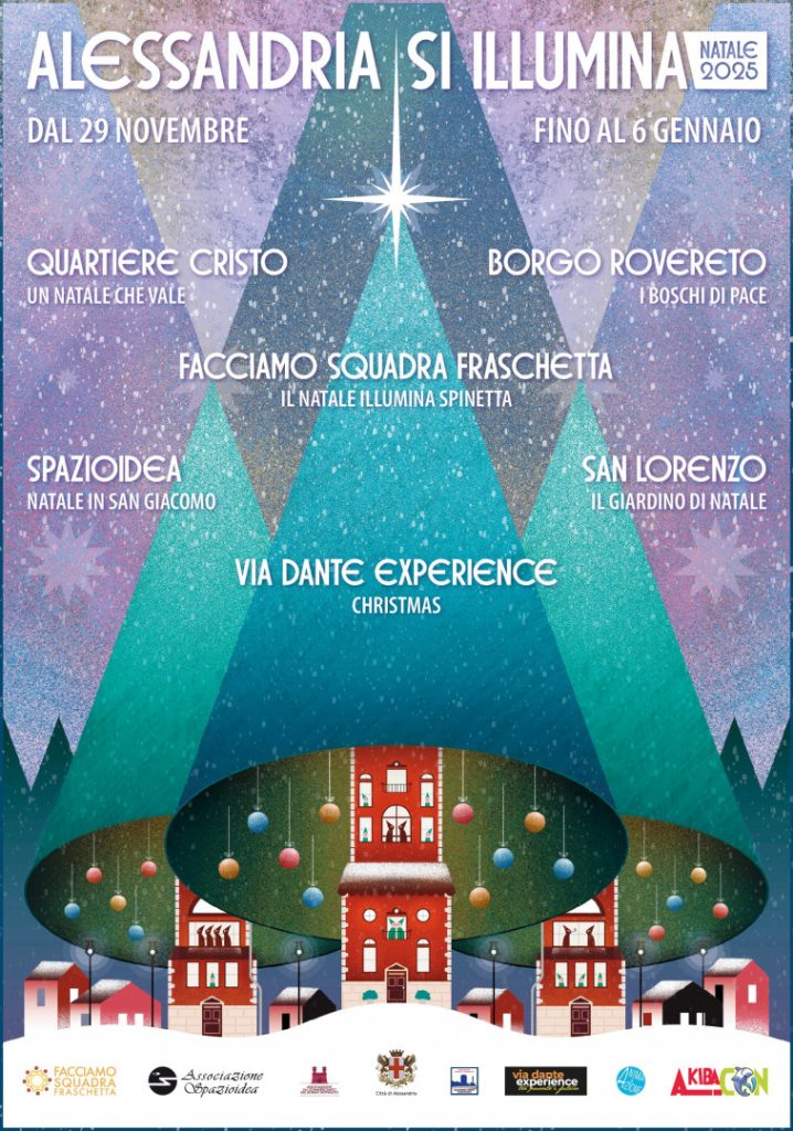 Anche quest’anno Alessandria si vestirà a festa per tutto il periodo natalizio con un programma ricchissimo di iniziative quotidiane pensate per tutte le età, che da sabato 29 novembre trasformeranno la Città in un luogo animato da luci, colori e spirito di condivisione. A partire dall’accensione del grande Albero della Città di Alessandria, quello in piazza della Libertà – in collaborazione con Paglieri Spa – e l’Albero di Natale di Piazza Garibaldi – in collaborazione con Kimono Casa – si avvicenderanno spettacoli luminosi itineranti, installazioni tematiche, percorsi urbani, visite guidate con degustazioni, mostre, performance teatrali, esibizioni musicali, flash mob, sfilate e concerti che coinvolgeranno non solo il centro storico, ma anche quartieri e sobborghi, grazie alla sinergia tra l’Amministrazione Comunale e le numerose Associazioni del territorio – Via Dante Experience, Borgo Rovereto, Quartiere Cristo, Facciamo Squadra Fraschetta, San Lorenzo e Spazioidea – promotrici dei vari appuntamenti, racchiusi sono il titolo “Alessandria si Illumina”, in programma fino al 6 gennaio prossimo.