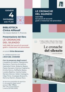 È in uscita l’ultimo libro “Le Cronache del Silenzio” e verrà presentato dalla curatrice Erica Bonansea e dai diciassette autori; il filo conduttore dei racconti sarà il mistero, raccolti in sei secoli di racconti gialli e misteriosi avvenuti nel pinerolese e in Piemonte. I racconti sono molto diversi tra loro sia come epoca, sia come ambientazione ma anche nel modo in cui vuole essere affrontato il tema del misterioso. Il primo racconto è ambientato sulla collina di Pinerolo all’inizio del XV secolo con la rivisitazione di una famosa leggenda locale; successivamente la narrazione approda in altri luoghi del Piemonte come Avigliana, Favria del Canavese, Bagnolo, San Secondo di Pinerolo, Luserna San Giovanni, le valli Chisone e Lemina fino a Torino, capitale del Regno di Sardegna.