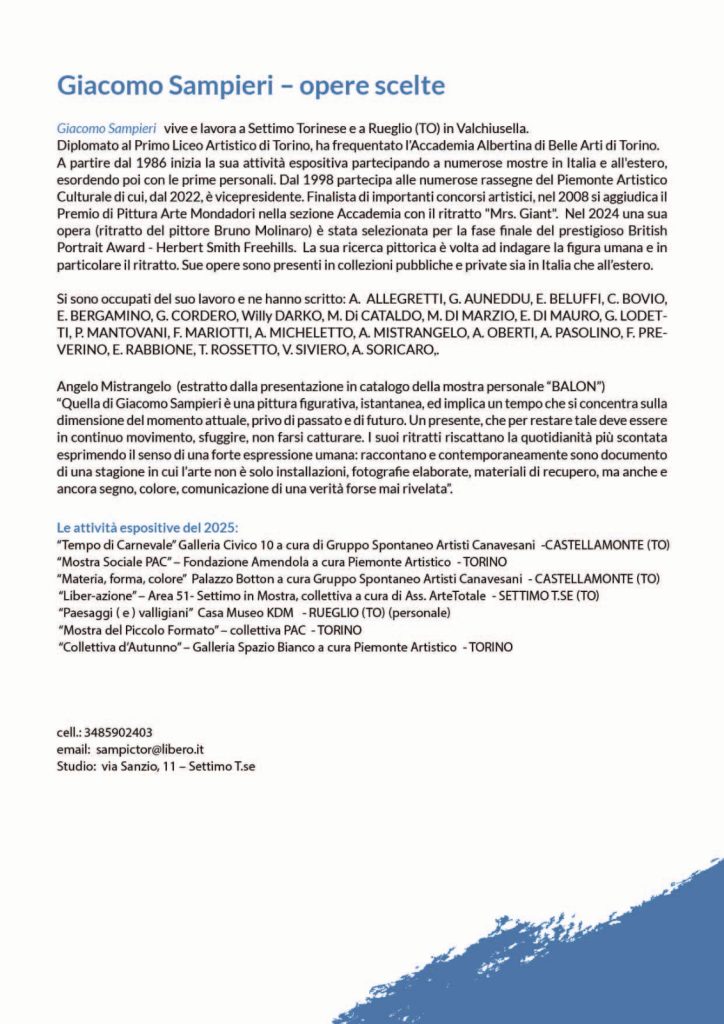 La stagione 2025 della rassegna “La lunga stagione dell’Arte cambianese” prosegue con la mostra dell’artista GIacomo Sampieri.