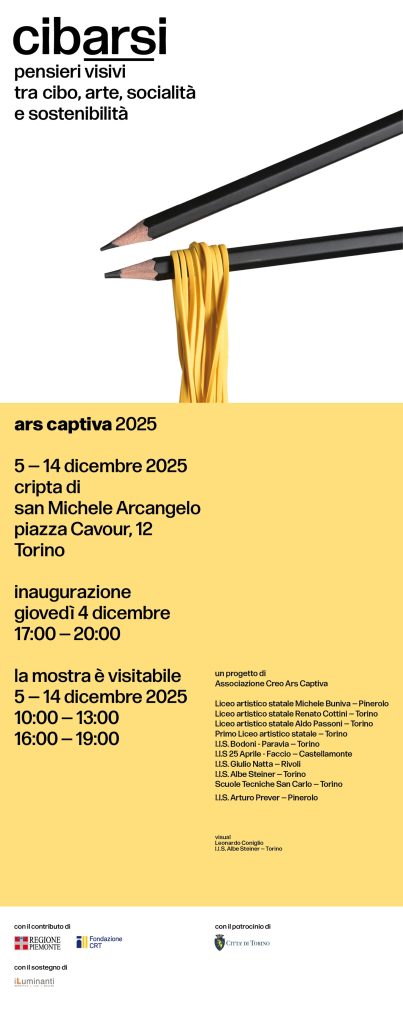 Nell’affascinante spazio della Cripta di San Michele Arcangelo, in Piazza Cavour 12, gli studenti e le studentesse delle scuole associate a CREOArs Captiva danno avvio a un consistente progetto triennale, sostenutoda Regione Piemonte e Fondazione CRT, impegnando la propriacreatività nella ricerca di idee e soluzioni riferite alle varie problematicitàlegate al cibo.Le indagini svolte e le proposte presentate in questa prima fase dai giovani creativi (auspicabili futuri architetti, designer, fotografi, artistivisuali… ) pongono attenzione a problemi di notevole rilevanza sociale e,su tutti, allo spreco alimentare nel contesto drammaticamente attuale dipovertà crescente.Sulla scorta di osservazioni fatte in classe e nell’incontro successivo con esperti di settore, i giovani progettisti formulano ipotesi finalizzate al miglioramento del benessere alimentare collettivo nelle realtà urbane.Da giovani attenti, esplorano i molteplici aspetti della relazione col cibo:dal rapporto sensoriale personale al piacere della condivisione, dalla riscoperta della tradizione all’incontro con le diversità culturali.Da adolescenti in crescita, consci che l’esercizio di comprensione della realtà sociale non può prescindere dall’osservazione preliminare sui comportamenti individuali, sanno mettersi in gioco anche con il racconto visivo – talvolta tragico, talvolta ironico e divertito – delle personali difficoltà a gestire responsabilmente i problemi della propria alimentazione.All’interno della parola Cibarsi, che dà nome al progetto, è contenuto il termine ars, a sottolineare il rapporto tra cibo e arte e l’approccio progettuale fantasioso e creativo suggerito per lo svolgimento deltema. La mostra presentata nella Cripta dà conto della ricchezza e dellavarietà dei materiali raccolti.I visitatori troveranno alle pareti, nei raccoglitori posti sui tavoli e neimonitor in sala, una molteplicità di bozzetti e proposte espresse allostato iniziale con freschezza e originalità, in un confronto positivo tranuove leve della creatività.Le migliori idee saranno oggetto di ulteriore approfondimento, erealizzate a breve per essere esposte nella prossima edizione di Cibarsi2026, nella quale gli autori potranno esprimersi in versioni concrete edefinite, com’è consuetudine nella tradizione di Ars Captiva.
