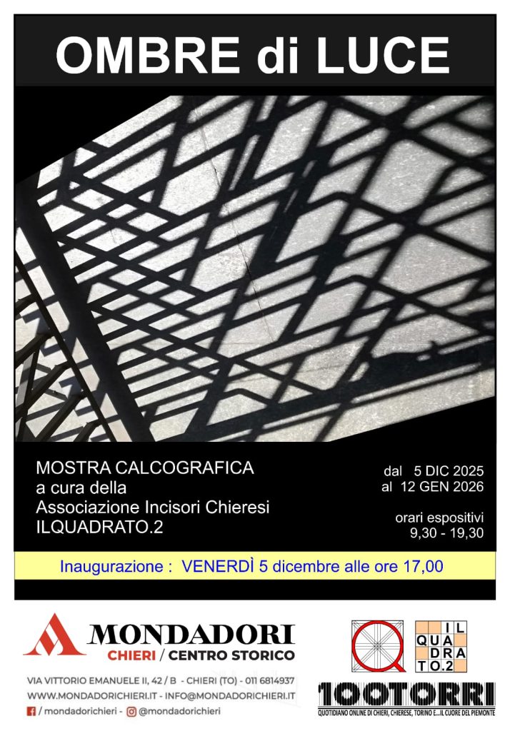 Il secondo appuntamento della rassegna “Arte tra i Libri”, a cura di PIEMONTE ARTE e Libreria Mondadori Centro Storico, è dedicato all’incisione. Dal 5 dicembre all’11 gennaio “Ombre di Luce”, mostra calcografica a cura della Associazione incisori chieresi “IlQuadrato.2”. L’associazione nasce nel 2014 per dare continuità a due realtà artistiche nate a Chieri: nel 1983 “Il Laboratorio” di incisione. Creato da Gianni Demo, e nel 1984 l’apertura della Galleria “Il Quadrato”. Lo scopo del laboratorio era quello di insegnare la tecnica del disegno e dell’acquaforte e far conoscere l’arte incisoria, mentre la galleria, fino al 2013, anno in cui cessa l’attività espositiva, ha contribuito attraverso innumerevoli esposizioni a presentare artisti importanti: Nino Aimone, Francesco Casorati, Mauro Chessa, Gianfranco Ferroni, Giacomo Soffiantino, solo per citarne alcuni…